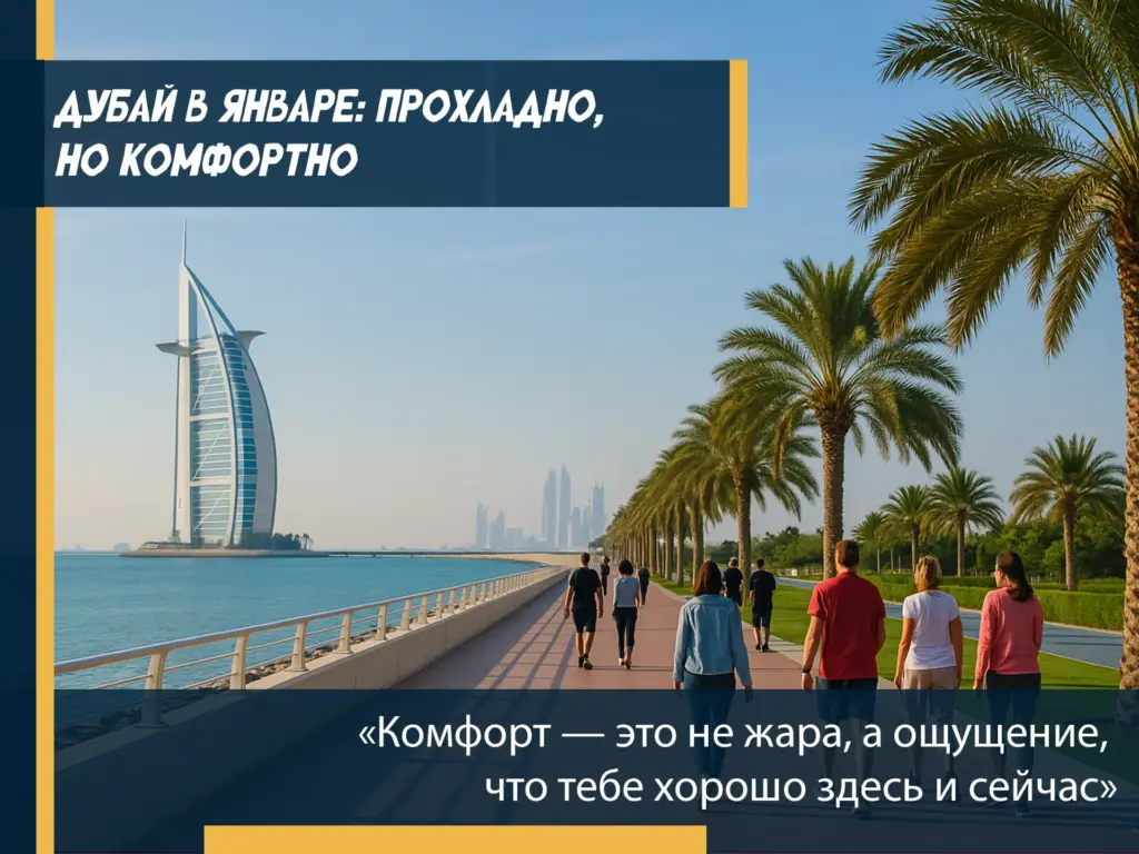 «Комфорт — это не жара, а ощущение, что тебе хорошо здесь и сейчас» ✅ Январь в Дубае — одно из самых приятных времён года: днём +23…+26°C, вечерами прохладнее, но свежо и уютно.✅ Это идеальная погода для прогулок по набережной, шопинга, экскурсий и ужинов под открытым небом без изнуряющего зноя.✅ Море остаётся тёплым — около +22°C, […]